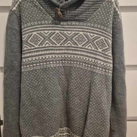 Mørk blå Helly Hansen genser. Lite trykk på bryst/stort trykk på rygg. Str Large.Knapt brukt! Selges for 150,-