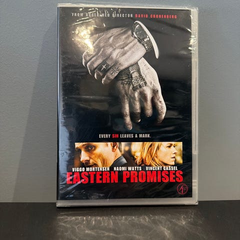 Eastern Promises DVD film med skuespillere Viggo Mortensen, Naomi Watts og Vincent Cassel. Inneholder spesialfunksjoner som bortklipte scener og kommentarspor. DVD-format. Norsk tekst.