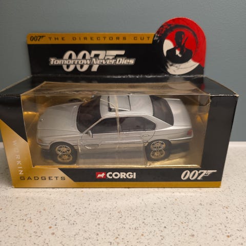 Corgi The Spy Who Loved Me Lotus Esprit modellbil i hvit farge. Modellen er basert på bilen fra filmen The Spy Who Loved Me, del av 007-serien. Samleobjekt med detaljerte funksjoner.