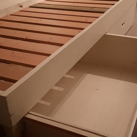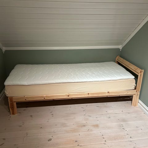 IKEA Jarnudda seng, med tynn overmadrass. Passer fint som en evt gjesteseng.