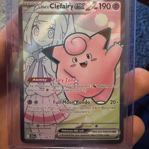 Pokémon Lillie & Clefairy EX samlekort med 190 HP og evnen Fairy Zone. Kortet har angrepet Full Moon Rondo som gjør 20+ skade for hver Energy-kort koblet til Clefairy.