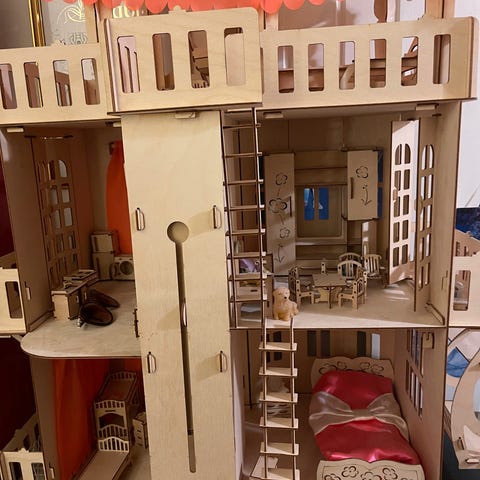 Selger ett godt brukt og stort dukkehus billig pga flere bruksmerker. Da vi fikk den brukt, var det litt maling på taket, men er mye bruk igjen.