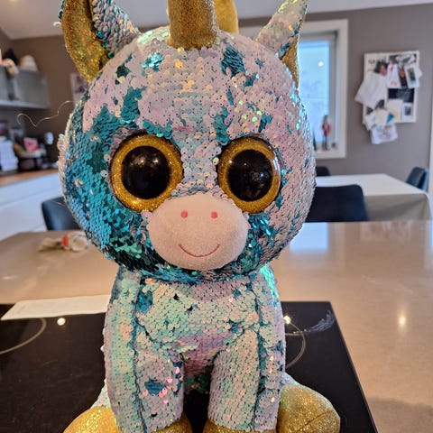 Squishmallows Jans kosedyr i rosa med dekorative fruktmotiver som kirsebær og vannmelon. Mykt materiale egnet for barn. 40 cm. Fått i gave, men uten byttelapp. Selges derfor videre til noen som kan ha mer glede av den. OBS: et lite hull ved tagen.