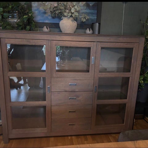 Skjenken er kjøpt på Ikea i 2025 og er hel og pen uten flekker, merker eller hakk. Jeg har satt på andre knotter enn de som fulgte med. Selges de jeg ikke lenger har behov for den. Sendes eller leveres ikke. Kan hentes på Røysåsen i Moss. Lett å hente med parkeringsplass rett utenfor bygget, og heis opp. N.B. Ta med bærehjelp da skjenken/skapet veier litt. Jeg kan ikke hjelpe til med bæring.