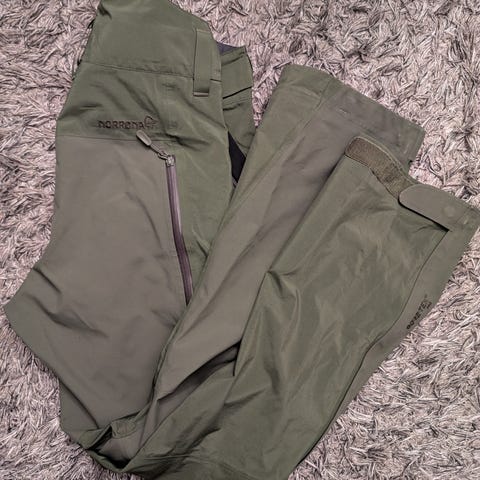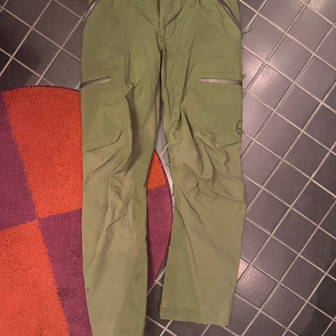 Har bruks merker nede ved sko enden av buksa, den har vert på reparasjon oss Norrøna men limen har gått opp i lappene.