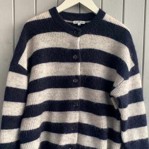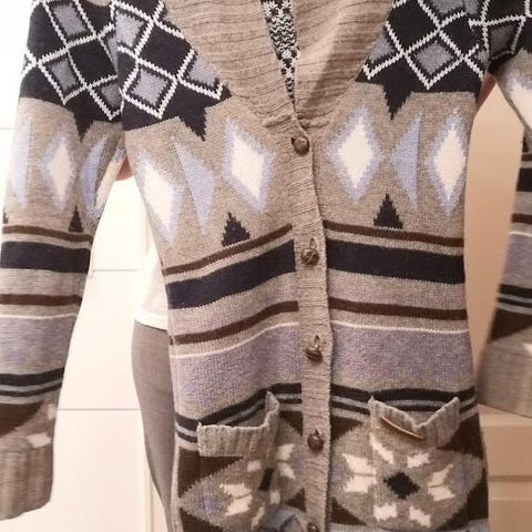Jean Paul cardigan, størrelse S men har oppgitt M da den er stor i størrelsen. Denne ligner Setesdalskoften; en tradisjonell norsk strikkejakke med et klassisk mønster i 100 % ull.