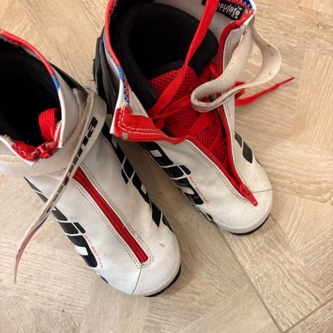 Skoene har blitt brukt til rulleski og har derfor fått en del skrapemerker på det ytterste laget. Ellers i fin stand.