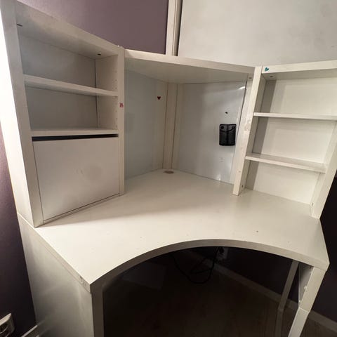 Selger et MICKE hjørneskrivebord fra IKEA. Det har bruksmerker på arbeidsbordet og noen klistremerker på siden, men masse bruk igjen! Selges billig siden vi har kjøpt nytt skrivebord.