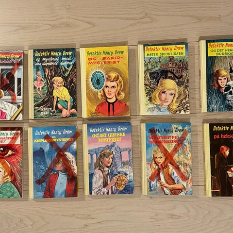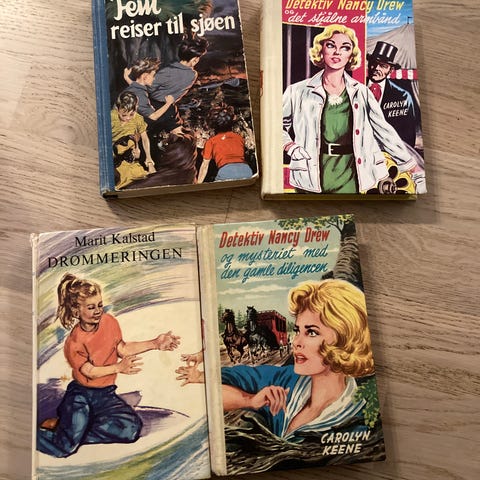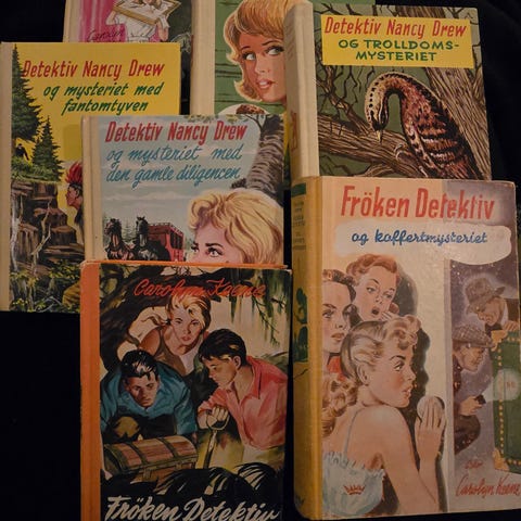 Alle 6 bøkene for 130. Enkeltvis Detektiv Nancy Drew - 25 per stk og Frøken Detektiv - 50 per stk. Forfatter Carolyn Keene.