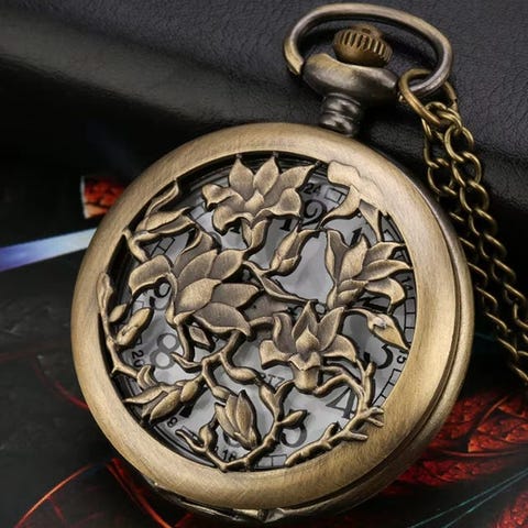 Pent steampunk / vintage antikk stil klokke i bronse farge. Kjedet er ca. 40 cm, selve lommeuret har en diameter på ca 4,5 cm.