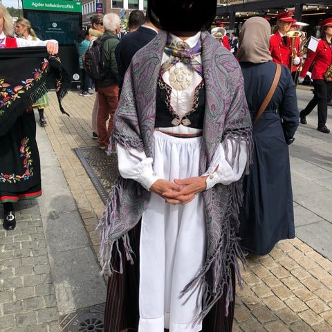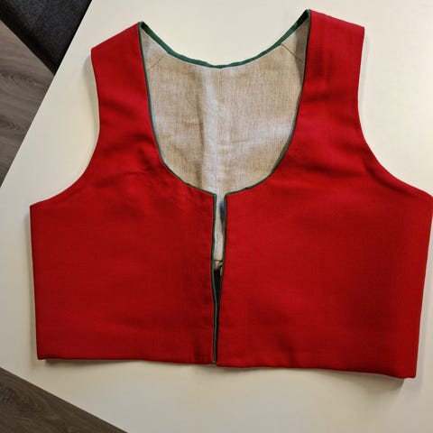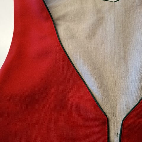 Rød ullvest med grønn kant, bise. Vest agder bunad