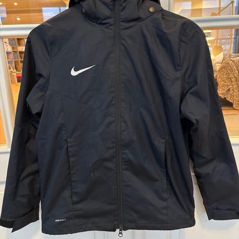 Nike treningsjakke til barn, str 158-170. Mørkeblå svart. Jakken har hette og glidelås, med et ytre lag som ser ut til å være vannavstøtende og et indre lag i fleece for ekstra varme. Brukt i forbindelse med fotball. Veldig god treningsjakke for kaldere dager.