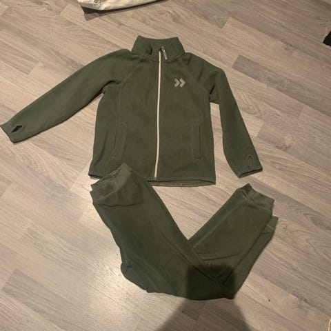 Selger et kjempefint fleece sett i leopardmønster. Pent brukt av ett barn. Buksen har elastisk midje. Str 134.