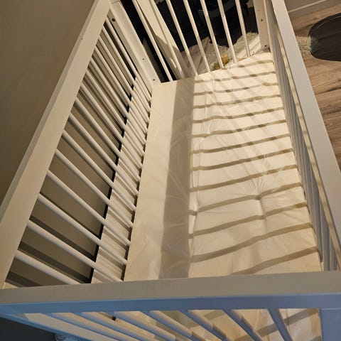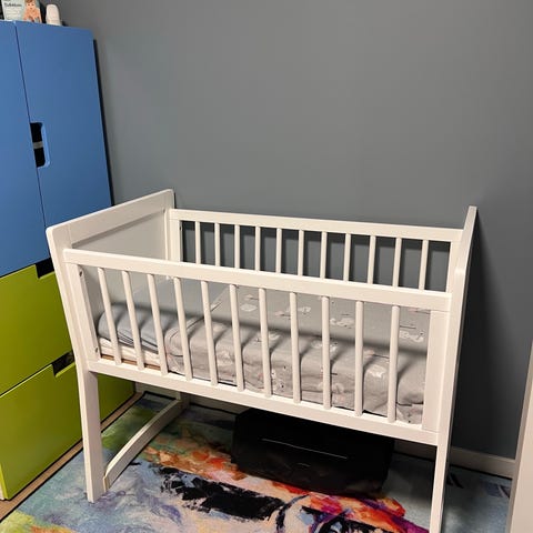Hvit babyseng med madrass