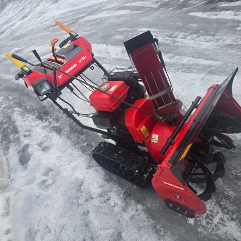 Yanmar YSR 971 c snøfreser med beltedrift. Maskinen har en rød farge og er designet for effektiv snørydding. Utstyrt med kontrollhendler og utkastkanal for snø. Egnet for bruk på ulike underlag med beltesystem for bedre fremkommelighet.