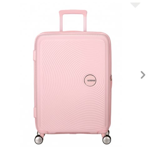 American Tourister kabinkoffert i plast. Kofferten har et rosa ytre, fire hjul og teleskophåndtak.
