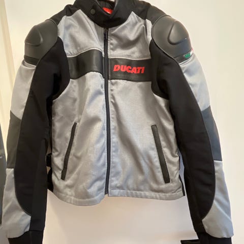 Ducati Dainese skinnjakke i rød og svart farge. Jakken er laget av skinn og har størrelse 58. Designet for motorsykkelbruk med beskyttende egenskaper.