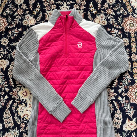 Bjørn Dæhlie høyhalset genser i ull, størrelse L, farge rosa. Genseren har en kombinasjon av rosa og hvite detaljer, og er designet for kvinner. Nesten ikke brukt 👌