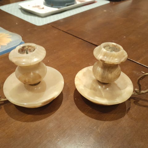 Sett med tre lysestaker laget av marmor. Hver lysestake har en unik marmorering og rund form. Passer til dekorasjon i hjemmet. Høyde 10 cm, 7,5 cm og 5 cm.