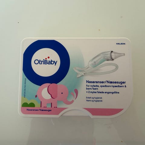 Otribaby nesesuger for barn. Produktet leveres i en boks som inneholder enheten for nesesuging. Designet for å hjelpe til med å fjerne slim fra barnets nese. Kjøpte den for 199