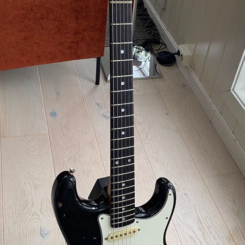 Svært pent brukt og lite bruksmerker. Den har et merke på baksiden etter å ha reagert med et gitarstativ (nitro), ellers hel og pen. Diverse forum på nettet sier at disse ofte kommer litt snodig koblet fra fabrikk og det gjelder også denne, hvor alle posisjoner fungerer som normalt med normal 3-way switch. Men når man trykker inn S-1 bryteren fungerer den som den skal med å koble neck og bridge i serie til "humbuckermodus", men er stille om man flipper til neckposisjon når S-1 er inne. Siden alle tilgjengelige lyder (Bridge alene, begge pickups i parallel, begge pickups i serie og neck alene), virker fint, har jeg ikke giddet gjort noe med dette men det er nok en enkel og kjapp fix om man ønsker. Det følger med Fender Elite Molded koffert.