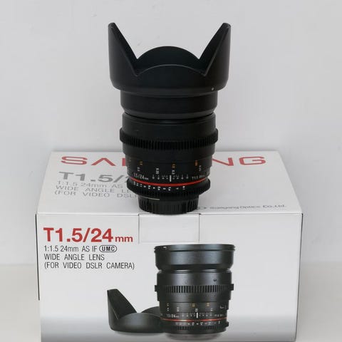 Samyang 24mm f/1.5 objektiv med manuell fokus og blenderkontroll. Objektivet har en brennvidde på 24 mm og maksimal blenderåpning på t/1.5, egnet for filming med lavt lys og kontroll over dybdeskarphet. Objektivet har en solid konstruksjon med fokus- og blenderringer for presis justering. For Sony, dekker full frame.