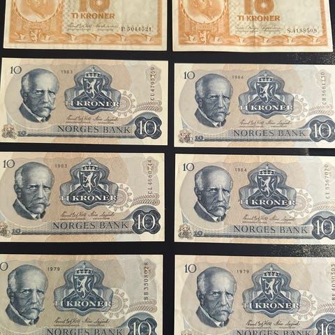 Norges Bank Norske sedler i valørene 10 og 100 kroner. Sedlene har ulike design og årstall, og er laget av papir. Passer for samlere eller som historiske gjenstander. Selges samlet