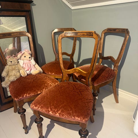 Gammel sofagruppe i mahogni. Pent holdt, ikke slitt i stoffet. Følger også med en lik spisestuestol i slitt skinn, og en stol lik den store, men i gammelt stoff.