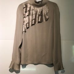 Nydelig silkebluse merket Made in Italy. Vid, rund utringning og 3/3 lange ermer. Flagrende og florlett bluse med elastisk for. Nydelig, sart beigefarge. Leveres skånsomt vasket og klar til bruk.