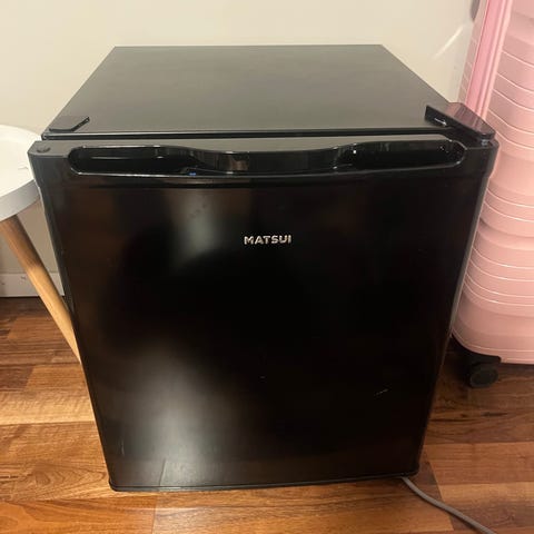 Logik mini-kjøleskap med svart farge. Kjøleskapet har en enkel design med hyller og dørrom for oppbevaring av mat og drikke. Døren kan bytte side slik at den kan tilpasses det miljøet den står i.