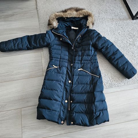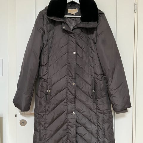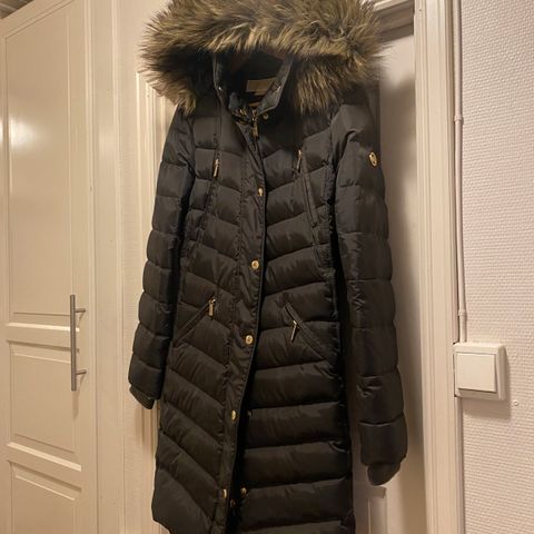 Svært lite brukt dunkåpe fra Michael Kors i str. XS selges. Har hengt i et tørt skap de siste 6 årene, så koselig om noen andre får brukt for den nå. Den er veldig lekker med sølvdetaljer og "pels" i kragen. Klassisk i stilen.