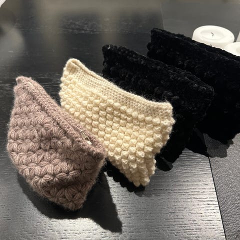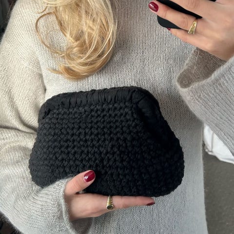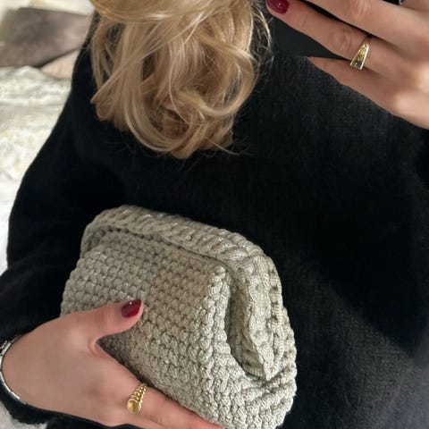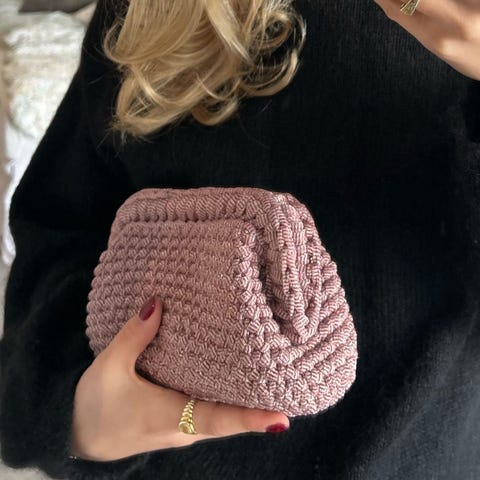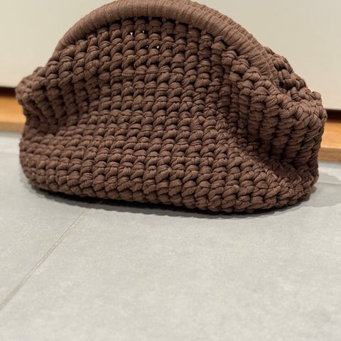 Heklet clutch i fargen kaffeblomst. Heklet i mykt stoff, med dobbel tråd for god hold. Vesken har ca. 30 cm bredde, selve clutch åpningen er 23 cm. Kan hekle i andre farger på forespørsel.