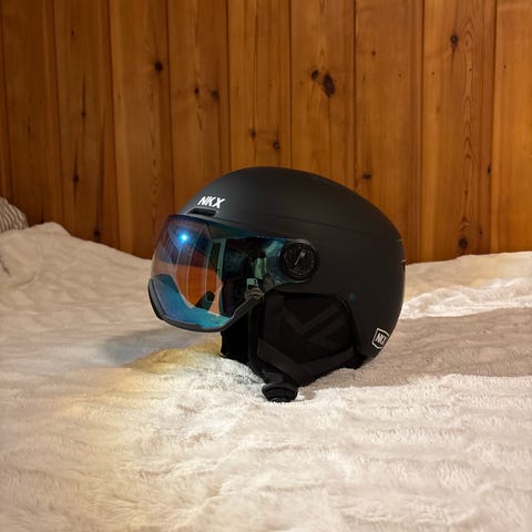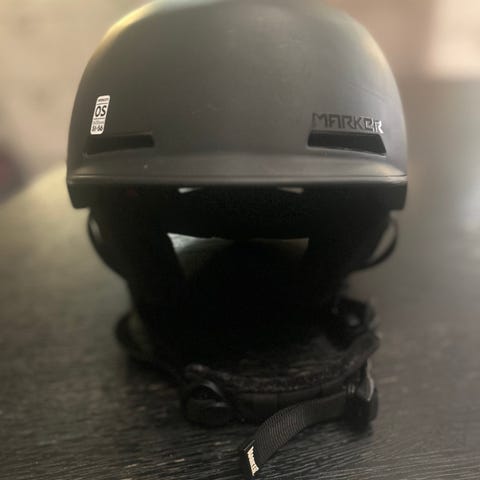 Salomon hjelm str 58 pluss Salomon briller. Det er et lite stekk midt på brillen, men det er ikke i synsfeltet så har ingen praktisk betydning.