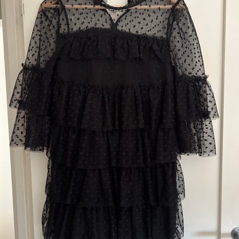 Marie Philippe festkjole i svart farge, størrelse 34. Kjolen har detaljer med broderier og perler.