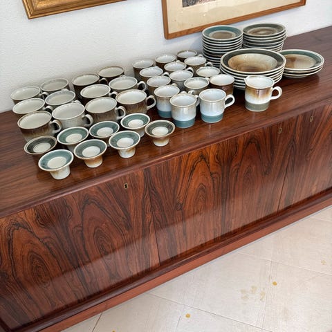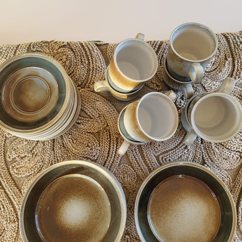 Pent brukt servise fra PP, Tundra, fra 1970 tallet til salgs. Serviset har en fargeskala i jordtoner med grønn, grå og beige og er håndmalt. Passer til daglig bruk og servering.