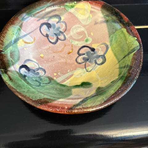 Nydelig keramikkfat med fargerikt mønster. Signert på baksiden av en Maria Le Amelie, Sao Paulo. Mer til signaturen, se bildet.