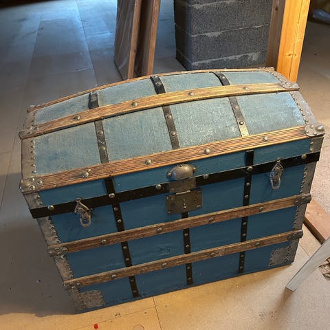 Antikk reiseskrin laget av tre med metallbeslag. Skrinet har flere metallstropper og låser, og innsiden er foret med stoff. Passer til oppbevaring av klær eller andre gjenstander.
