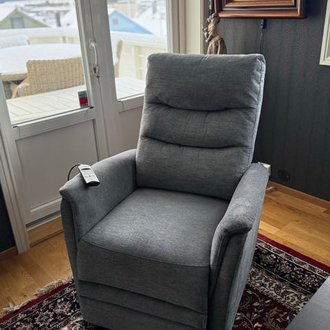 God elektrisk stol med fothviler. Selges da den tar for mye plass. Må bæres ned fra 2 etasje. Må være 2 mann. Stolen står hos min mor på Madla