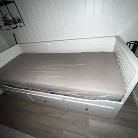 Selger ei gjeste seng har ikke vært lite brukt, alder på senga er uvisst, gode å ligge i, kan få med overmadrass hvis det er ønskelig til samme pris. Kjøper må hente den.