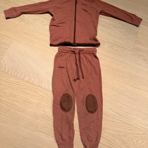 Rosa ullsett, har mye flekker, buksa har en rift under kneet.