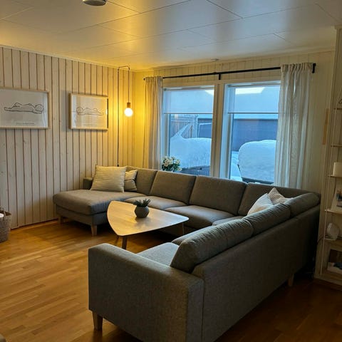 Hjørnesofaen er godt brukt, men fremstår fortsatt i god stand.