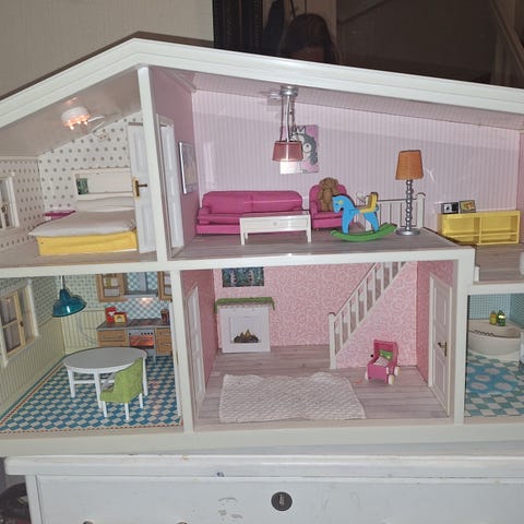 Lundby dukkehus med flere rom og innredning. Huset har en rosa og hvit fargepalett med tapetmønster på veggene. Inkluderer møbler og tilbehør som kan plasseres i huset. Passer for barn som liker å leke med dukker og innredning.