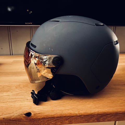 Cebe bow vision jr hjelm med visir (51-53cm). Hjelmen er pent brukt og kun på alpint. Noen riper i glasset etter bruk. Ikke vært i noen ulykker. Helt genialt for barn med briller. Hjelmpose følger med.