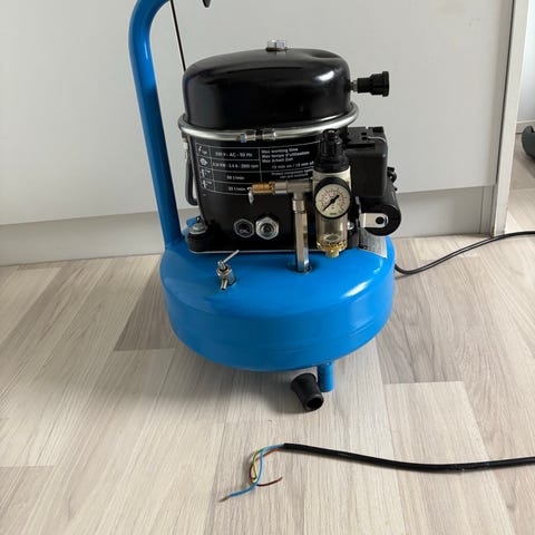 Stillegående kompressor fra Jun-Air. Brukt til hobbyprosjekter. Modellen er Jun-Air 6-4, og manualen medfølger.