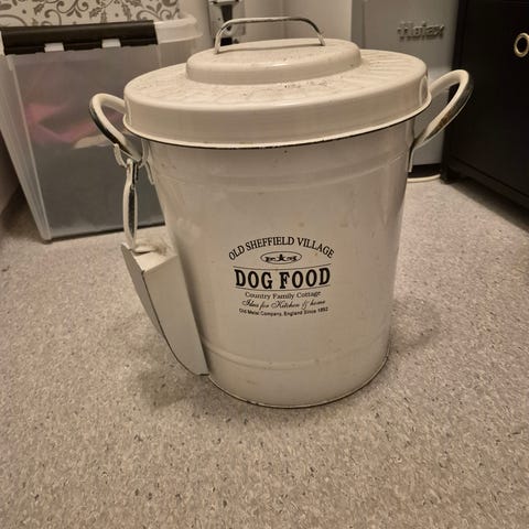 Stor beholder til hundefôr, lokket kan "klikkes" på plass så hunden ikke klarer å åpne.