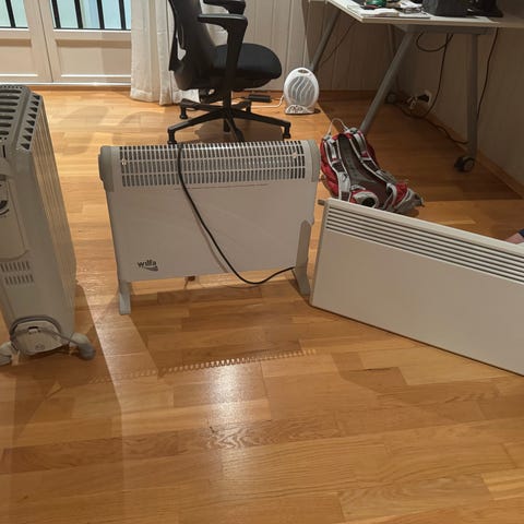 Siemens elektrisk varmeovn med justerbar termostat og metallhus. Enheten har en hvit farge og kabel for tilkobling til strøm. Designet for oppvarming av mindre rom eller områder.