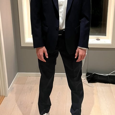 Selger en slim fit dress fra Dressmann i str 46. Fargen er mørkblå, fint lyseblått inner for. Sønnen min fikk den til konfirmasjonen og har brukt den ved noen få anledninger utenom dette. Den er i fin stand.