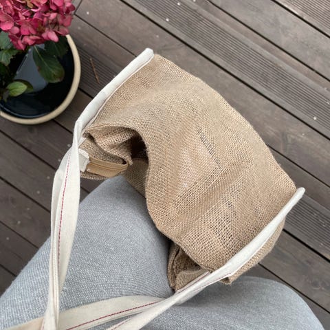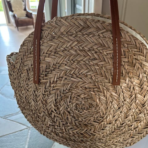 Vintage veske i strå/jute. Rutete fôr i bomull.