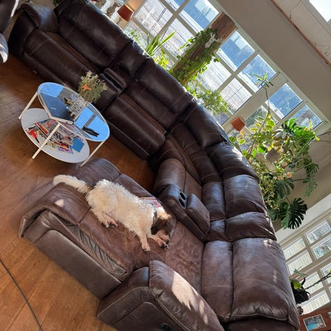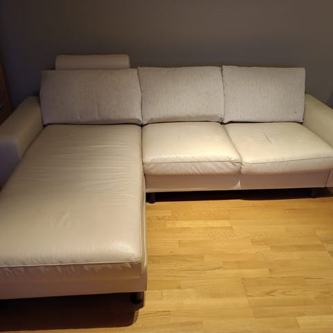 God soffa, godt brukt, må enten fikses mellom hjørne og kortfeste eller bruke noe for å bygge opp under. Et av festene mangler.