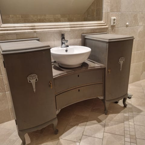 servantskap med integrert servant i hvit farge. Inkluderer speilskap med glasshyller og oppbevaringsplass under servant med skuffer og skapdører.